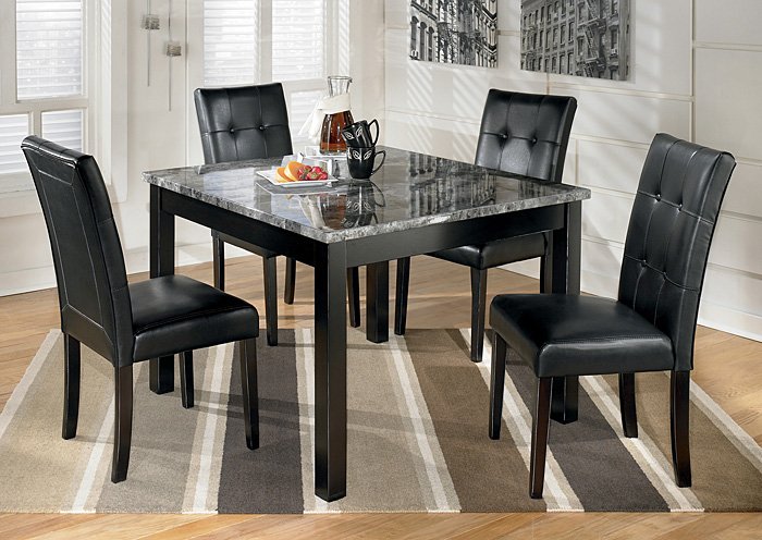 With the rich black finished legs supporting the gray tones of the polyurethane coated print marble table top, the sleek contemporary design of the "Maysville" dining collection creates comfortable dining with the stylish look of the black faux leather button-tufted upholstered seating.