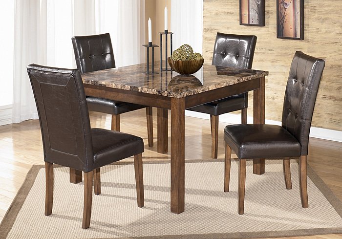 The rich contemporary style of the "Theo" Counter Height Table combines faux marble and a warm finish to create dining room furniture that adds an exciting style to the decor of any home. The thick polyurethane coated faux marble table top perfectly accentuates the warm brown finish flowing over the straight-lined contemporary design of the apron and legs to help create an exceptional dining experience. With the beautiful stitching and button tufting details of the faux leather upholstered bar stools, the "Theo" Counter Height Table is a refreshing addition to any home.