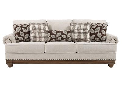 True classic character comes to life in the Harleson sofa. Set back pleated rolled arms and warm brown exposed frame with bun feet are beautifully traditional. Lovely detailing carries itself through the herringbone weave in the soft upholstery. Seat cushions reverse to maintain durable comfort. Vintage-inspired jumbo nailhead trim graces the design. Plaid and botanical pillows in dark brown are a timeless touch.